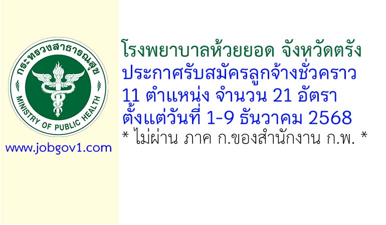 โรงพยาบาลห้วยยอด รับสมัครลูกจ้างชั่วคราว 21 อัตรา ตั้งแต่วันที่ 1-9 ธันวาคม 2568