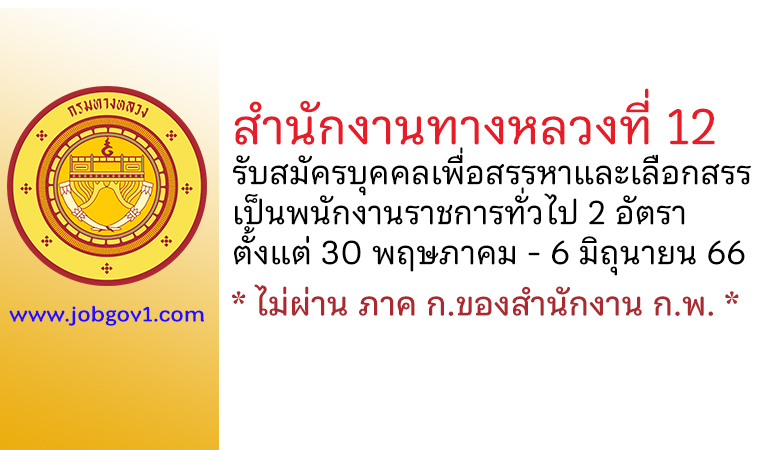 สำนักงานทางหลวงที่ 12 รับสมัครบุคคลเพื่อสรรหาและเลือกสรรเป็นพนักงานราชการทั่วไป 2 อัตรา ตั้งแต่ 30 พฤษภาคม – 6 มิถุนายน 2566