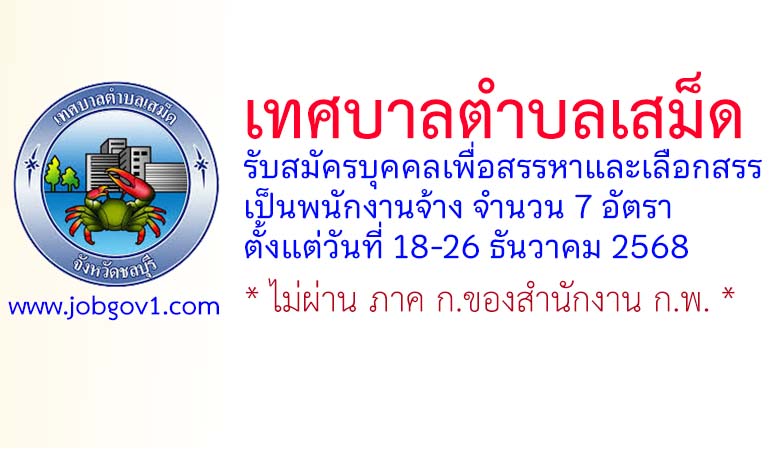 เทศบาลตำบลเสม็ด รับสมัครบุคคลเพื่อสรรหาและเลือกสรรเป็นพนักงานจ้าง 7 อัตรา ตั้งแต่วันที่ 18-26 ธันวาคม 2568