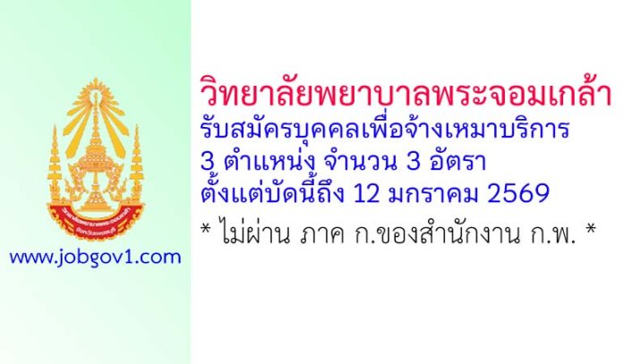 วิทยาลัยพยาบาลพระจอมเกล้า จังหวัดเพชรบุรี รับสมัครบุคคลเพื่อจ้างเหมาบริการ 3 อัตรา ตั้งแต่บัดนี้ถึง 12 มกราคม 2569