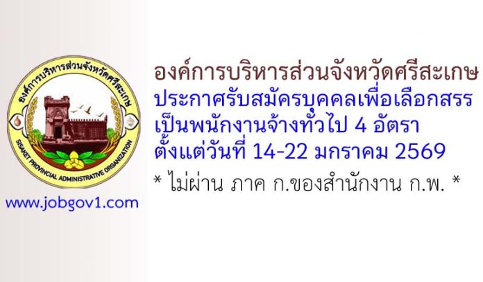องค์การบริหารส่วนจังหวัดศรีสะเกษ รับสมัครบุคคลเพื่อเลือกสรรเป็นพนักงานจ้างทั่วไป 4 อัตรา ตั้งแต่วันที่ 14-22 มกราคม 2569