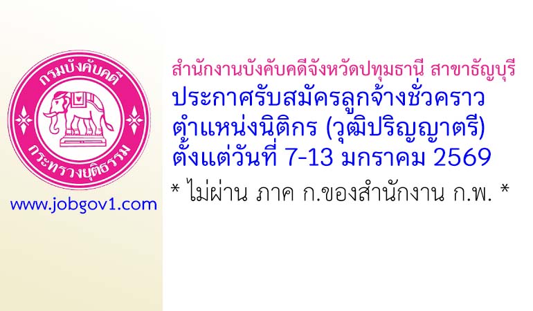 สำนักงานบังคับคดีจังหวัดปทุมธานี สาขาธัญบุรี รับสมัครลูกจ้างชั่วคราว ตำแหน่งนิติกร ตั้งแต่วันที่ 7-13 มกราคม 2569
