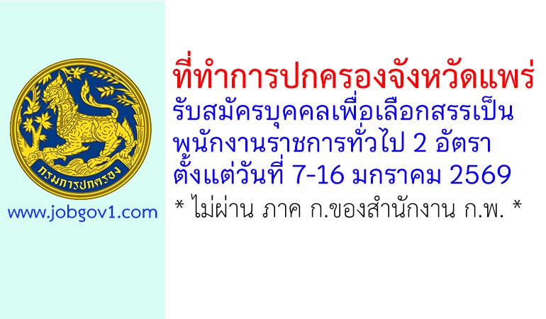 ที่ทำการปกครองจังหวัดแพร่ รับสมัครบุคคลเพื่อเลือกสรรเป็นพนักงานราชการทั่วไป 2 อัตรา ตั้งแต่วันที่ 7-16 มกราคม 2569