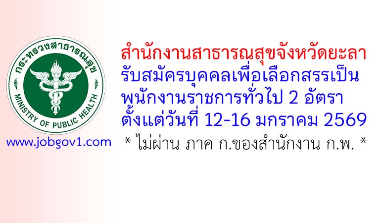 สำนักงานสาธารณสุขจังหวัดยะลา รับสมัครบุคคลเพื่อเลือกสรรเป็นพนักงานราชการทั่วไป 2 อัตรา ตั้งแต่วันที่ 12-16 มกราคม 2569
