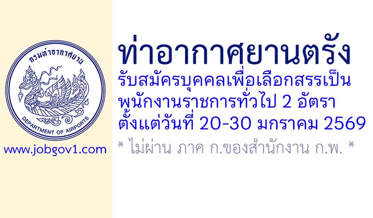 ท่าอากาศยานตรัง รับสมัครบุคคลเพื่อเลือกสรรเป็นพนักงานราชการทั่วไป 2 อัตรา ตั้งแต่วันที่ 20-30 มกราคม 2569