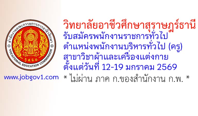 วิทยาลัยอาชีวศึกษาสุราษฎร์ธานี รับสมัครพนักงานราชการทั่วไป ตำแหน่งพนักงานบริหารทั่วไป (ครู) สาขาวิชาผ้าและเครื่องแต่งกาย ตั้งแต่วันที่ 12-19 มกราคม 2569