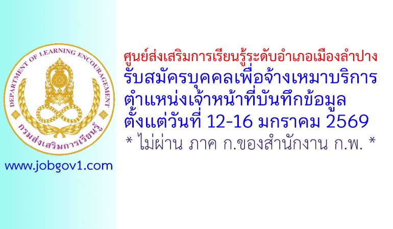 ศูนย์ส่งเสริมการเรียนรู้ระดับอำเภอเมืองลำปาง รับสมัครบุคคลเพื่อจ้างเหมาบริการ ตำแหน่งเจ้าหน้าที่บันทึกข้อมูล ตั้งแต่วันที่ 12-16 มกราคม 2569