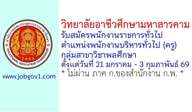 วิทยาลัยอาชีวศึกษามหาสารคาม รับสมัครพนักงานราชการทั่วไป ตำแหน่งพนักงานบริหารทั่วไป (ครู) กลุ่มสาขาวิชาพลศึกษา ตั้งแต่วันที่ 21 มกราคม – 3 กุมภาพันธ์ 2569