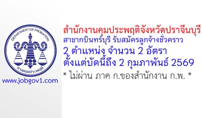สำนักงานคุมประพฤติจังหวัดปราจีนบุรี สาขากบินทร์บุรี รับสมัครลูกจ้างชั่วคราว 2 อัตรา ตั้งแต่บัดนี้ถึง 2 กุมภาพันธ์ 2569