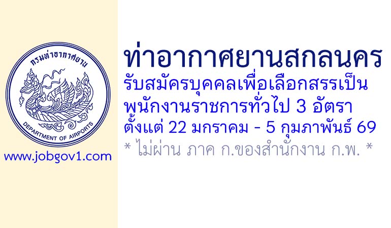 ท่าอากาศยานสกลนคร รับสมัครบุคคลเพื่อเลือกสรรเป็นพนักงานราชการทั่วไป 3 อัตรา ตั้งแต่ 22 มกราคม – 5 กุมภาพันธ์ 2569