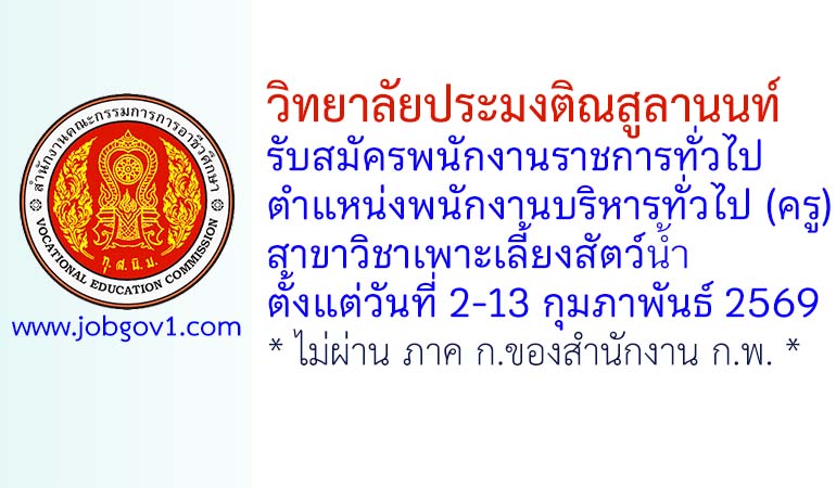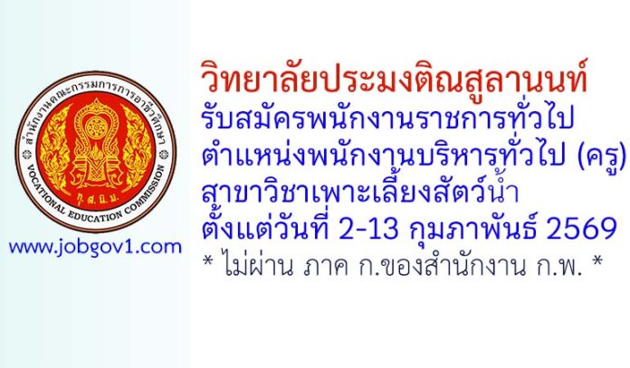 วิทยาลัยประมงติณสูลานนท์ รับสมัครพนักงานราชการทั่วไป ตำแหน่งพนักงานบริหารทั่วไป (ครู) สาขาวิชาเพาะเลี้ยงสัตว์น้ำ ตั้งแต่วันที่ 2-13 กุมภาพันธ์ 2569