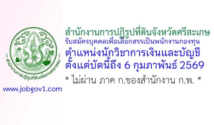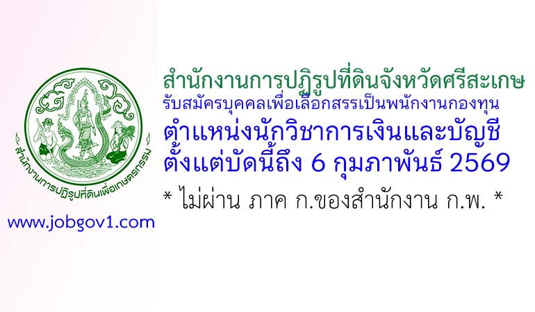 ประกาศจังหวัดศรีสะเกษ เรื่อง รับสมัครบุคคลเพื่อเลือกสรรเป็นพนักงานกองทุนการปฏิรูปที่ดินเพื่อเกษตรกรรม ตำแหน่งนักวิชาการเงินและบัญชี สังกัดสำนักงานการปฏิรูปที่ดินจังหวัดศรีสะเกษ