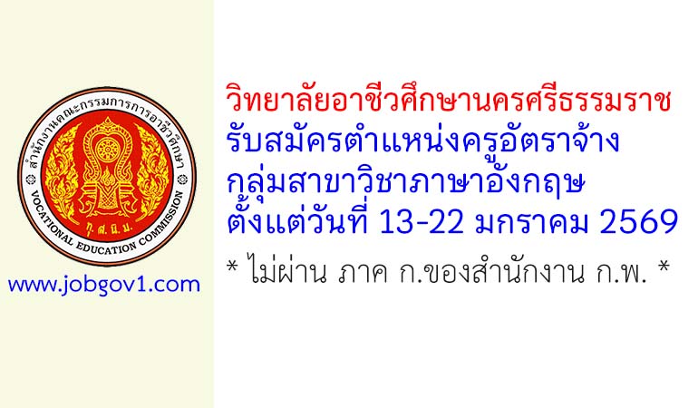 วิทยาลัยอาชีวศึกษานครศรีธรรมราช รับสมัครครูอัตราจ้าง กลุ่มสาขาวิชาภาษาอังกฤษ ตั้งแต่วันที่ 13-22 มกราคม 2569