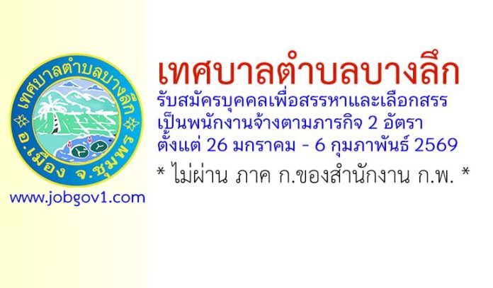 เทศบาลตำบลบางลึก รับสมัครบุคคลเพื่อสรรหาและเลือกสรรเป็นพนักงานจ้างตามภารกิจ 2 อัตรา ตั้งแต่ 26 มกราคม – 6 กุมภาพันธ์ 2569