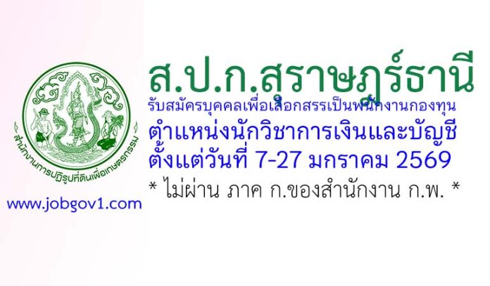 ส.ป.ก.สุราษฎร์ธานี รับสมัครบุคคลเพื่อเลือกสรรเป็นพนักงานกองทุน ตำแหน่งนักวิชาการเงินและบัญชี ตั้งแต่วันที่ 7-27 มกราคม 2569
