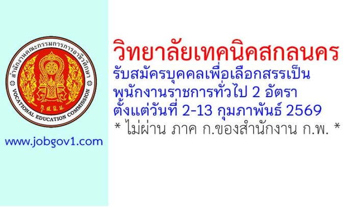วิทยาลัยเทคนิคสกลนคร รับสมัครบุคคลเพื่อเลือกสรรเป็นพนักงานราชการทั่วไป 2 อัตรา ตั้งแต่วันที่ 2-13 กุมภาพันธ์ 2569