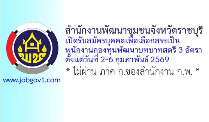 สำนักงานพัฒนาชุมชนจังหวัดราชบุรี รับสมัครบุคคลเพื่อเลือกสรรเป็นพนักงานกองทุนพัฒนาบทบาทสตรี 3 อัตรา ตั้งแต่วันที่ 2-6 กุมภาพันธ์ 2569