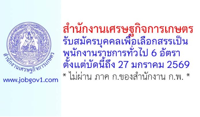 สำนักงานเศรษฐกิจการเกษตร รับสมัครบุคคลเพื่อเลือกสรรเป็นพนักงานราชการทั่วไป 6 อัตรา ตั้งแต่บัดนี้ถึง 27 มกราคม 2569