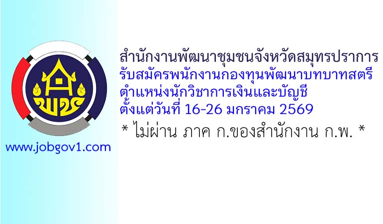สำนักงานพัฒนาชุมชนจังหวัดสมุทรปราการ รับสมัครพนักงานกองทุนพัฒนาบทบาทสตรี ตำแหน่งนักวิชาการเงินและบัญชี ตั้งแต่วันที่ 16-26 มกราคม 2569