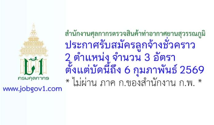 สำนักงานศุลกากรตรวจสินค้าท่าอากาศยานสุวรรณภูมิ รับสมัครลูกจ้างชั่วคราว 3 อัตรา ตั้งแต่บัดนี้ถึง 6 กุมภาพันธ์ 2569
