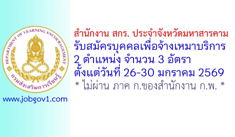 ประกาศสำนักงานส่งเสริมการเรียนรู้ประจำจังหวัดมหาสารคาม เรื่อง รับสมัครคัดเลือกบุคคลเพื่อจ้างเหมาเอกชนดำเนินงาน ตำแหน่งบรรณารักษ์ จำนวน 1 อัตรา และตำแหน่งพนักงานรักษาความปลอดภัย จำนวน 2 อัตรา ประจำปีงบประมาณ พ.ศ. 2569