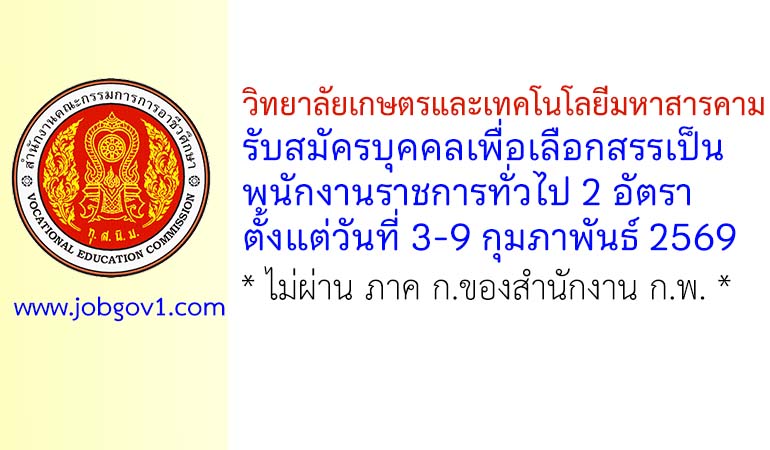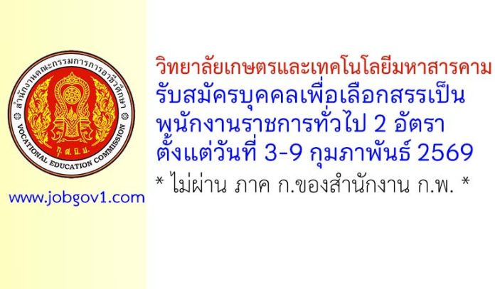 วิทยาลัยเกษตรและเทคโนโลยีมหาสารคาม รับสมัครบุคคลเพื่อเลือกสรรเป็นพนักงานราชการทั่วไป 2 อัตรา ตั้งแต่วันที่ 3-9 กุมภาพันธ์ 2569