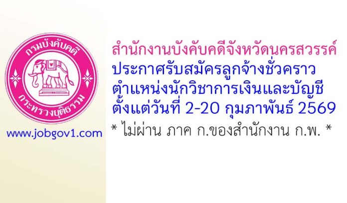 สำนักงานบังคับคดีจังหวัดนครสวรรค์ รับสมัครลูกจ้างชั่วคราว ตำแหน่งนักวิชาการเงินและบัญชี ตั้งแต่วันที่ 2-20 กุมภาพันธ์ 2569