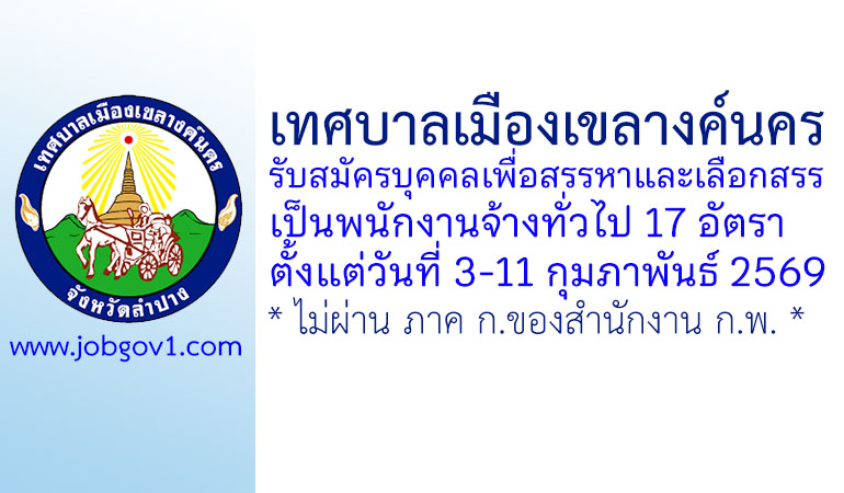 เทศบาลเมืองเขลางค์นคร รับสมัครบุคคลเพื่อสรรหาและเลือกสรรเป็นพนักงานจ้างทั่วไป 17 อัตรา ตั้งแต่วันที่ 3-11 กุมภาพันธ์ 2569