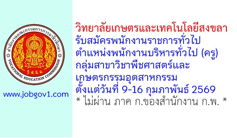 วิทยาลัยเกษตรและเทคโนโลยีสงขลา รับสมัครพนักงานราชการทั่วไป ตำแหน่งพนักงานบริหารทั่วไป (ครู) กลุ่มสาขาวิชาพืชศาสตร์และเกษตรกรรมอุตสาหกรรม ตั้งแต่วันที่ 9-16 กุมภาพันธ์ 2569