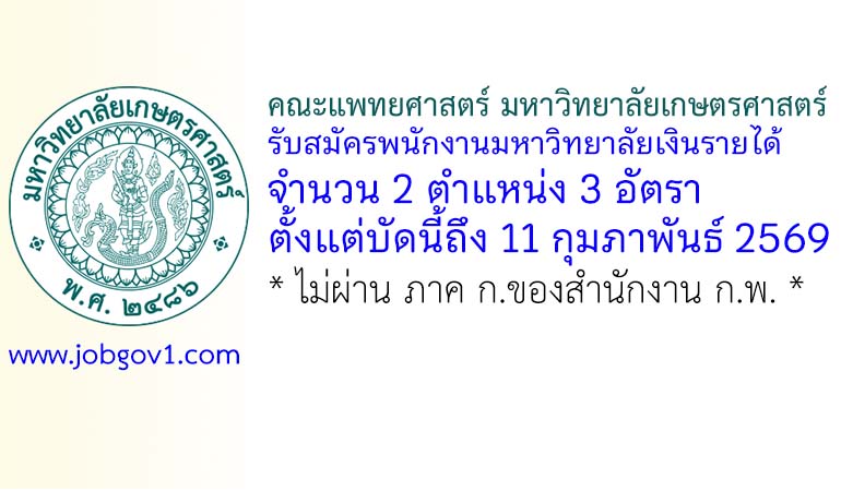 คณะแพทยศาสตร์ มหาวิทยาลัยเกษตรศาสตร์ รับสมัครพนักงานมหาวิทยาลัยเงินรายได้ 3 อัตรา ตั้งแต่บัดนี้ถึง 11 กุมภาพันธ์ 2569