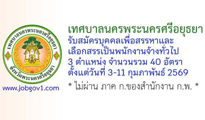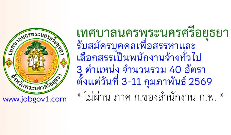 เทศบาลนครพระนครศรีอยุธยา รับสมัครบุคคลเพื่อสรรหาและเลือกสรรเป็นพนักงานจ้างทั่วไป 40 อัตรา ตั้งแต่วันที่ 3-11 กุมภาพันธ์ 2569