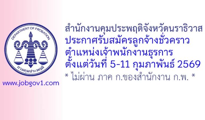 สำนักงานคุมประพฤติจังหวัดนราธิวาส รับสมัครลูกจ้างชั่วคราว ตำแหน่งเจ้าพนักงานธุรการ ตั้งแต่วันที่ 5-11 กุมภาพันธ์ 2569