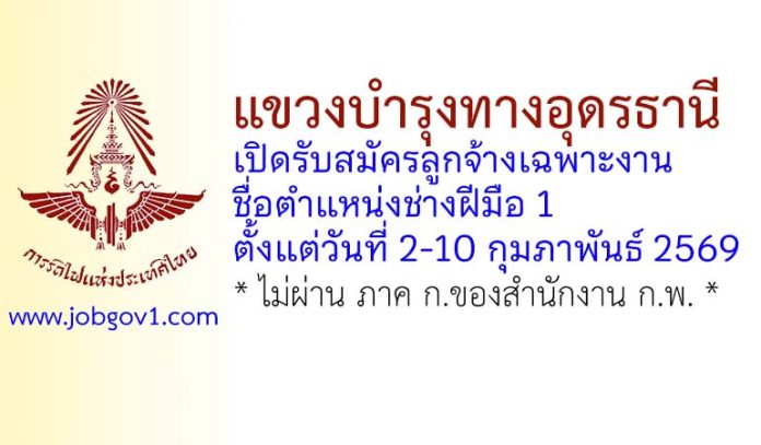 ด้วยแขวงบำรุงทางอุดรธานี กองบำรุงทางเขตขอนแก่น ศูนย์บำรุงทางภาค ตะวันออกเฉียงเหนือ ฝ่ายการช่างโยธา การรถไฟแห่งประเทศไทย มีความประสงค์รับสมัครบุคคลภายนอก เข้าทำงานเป็นลูกจ้างเฉพาะงานในตำแหน่งช่างฝีมือ 1 ตอนนายตรวจทางอุดรธานี จำนวน 1 อัตรา เพื่อปฏิบัติงานด้านซ่อมบำรุงทางและงานด้านโยธาอื่น ๆ ทดแทนตำแหน่งเดิมที่ว่างลง โดยให้รับค่าจ้างวัน ละ 400.-บาท (สี่ร้อยบาทถ้วน) มีกำหนดระยะเวลาจ้างตั้งแต่วันที่กองบำรุงทางเขตขอนแก่นออกคำสั่งจ้าง จนถึงวันที่ 31 มีนาคม 2569 (จ้างไม่เกิน 1 ปี) โดยมีรายละเอียดดังนี้