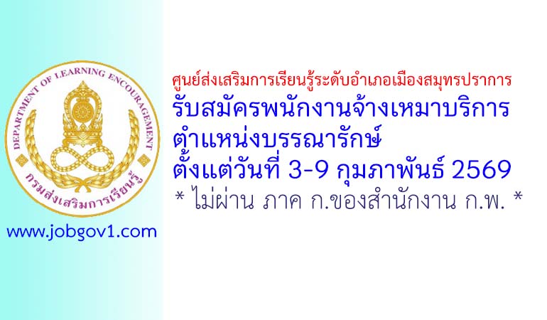 ศูนย์ส่งเสริมการเรียนรู้ระดับอำเภอเมืองสมุทรปราการ รับสมัครพนักงานจ้างเหมาบริการ ตำแหน่งบรรณารักษ์ ตั้งแต่วันที่ 3-9 กุมภาพันธ์ 2569
