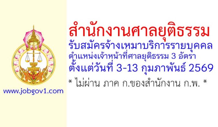 สำนักงานศาลยุติธรรม รับสมัครจ้างเหมาบริการรายบุคคล ตำแหน่งเจ้าหน้าที่ศาลยุติธรรม 3 อัตรา ตั้งแต่วันที่ 3-13 กุมภาพันธ์ 2569