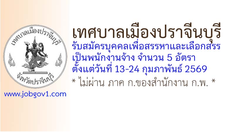 เทศบาลเมืองปราจีนบุรี รับสมัครบุคคลเพื่อสรรหาและเลือกสรรเป็นพนักงานจ้าง 5 อัตรา ตั้งแต่วันที่ 13-24 กุมภาพันธ์ 2569