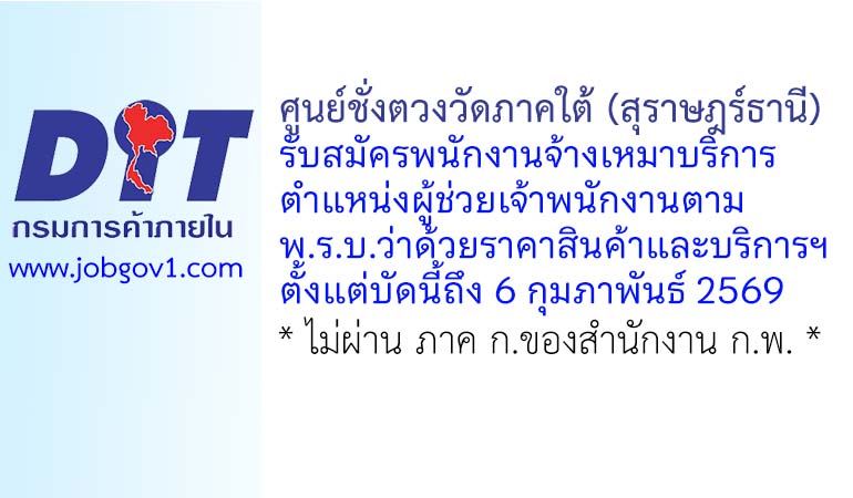 ศูนย์ชั่งตวงวัดภาคใต้ (สุราษฎร์ธานี) รับสมัครพนักงานจ้างเหมาบริการ ตำแหน่งผู้ช่วยเจ้าพนักงานตาม พ.ร.บ.ว่าด้วยราคาสินค้าและบริการฯ ตั้งแต่บัดนี้ถึง 6 กุมภาพันธ์ 2569