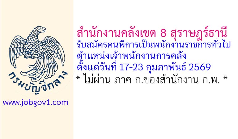 สำนักงานคลังเขต 8 รับสมัครคนพิการเป็นพนักงานราชการทั่วไป ตำแหน่งเจ้าพนักงานการคลัง ตั้งแต่วันที่ 17-23 กุมภาพันธ์ 2569