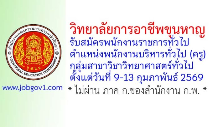 วิทยาลัยการอาชีพขุนหาญ รับสมัครพนักงานราชการทั่วไป ตำแหน่งพนักงานบริหารทั่วไป (ครู) กลุ่มสาขาวิชาวิทยาศาสตร์ทั่วไป ตั้งแต่วันที่ 9-13 กุมภาพันธ์ 2569