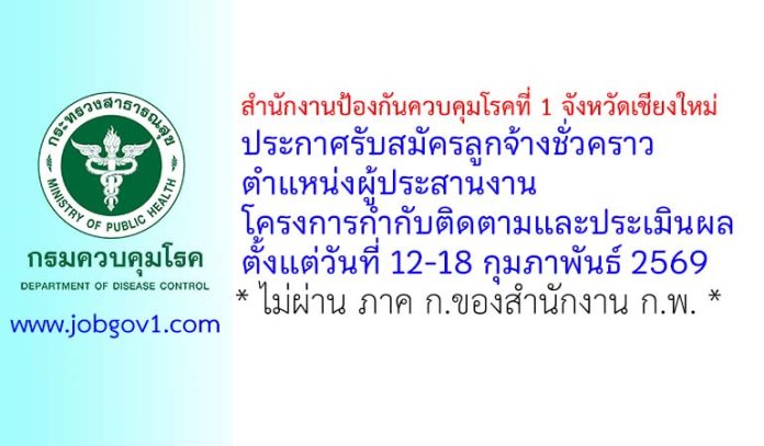 สำนักงานป้องกันควบคุมโรคที่ 1 จังหวัดเชียงใหม่ รับสมัครลูกจ้างชั่วคราว ตำแหน่งผู้ประสานงานโครงการกำกับติดตามและประเมินผล ตั้งแต่วันที่ 12-18 กุมภาพันธ์ 2569