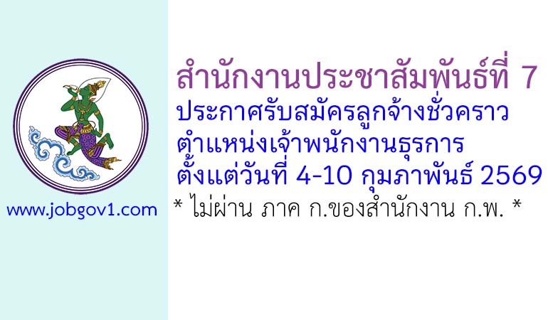 สำนักงานประชาสัมพันธ์ที่ 7 รับสมัครลูกจ้างชั่วคราว ตำแหน่งเจ้าพนักงานธุรการ ตั้งแต่วันที่ 4-10 กุมภาพันธ์ 2569