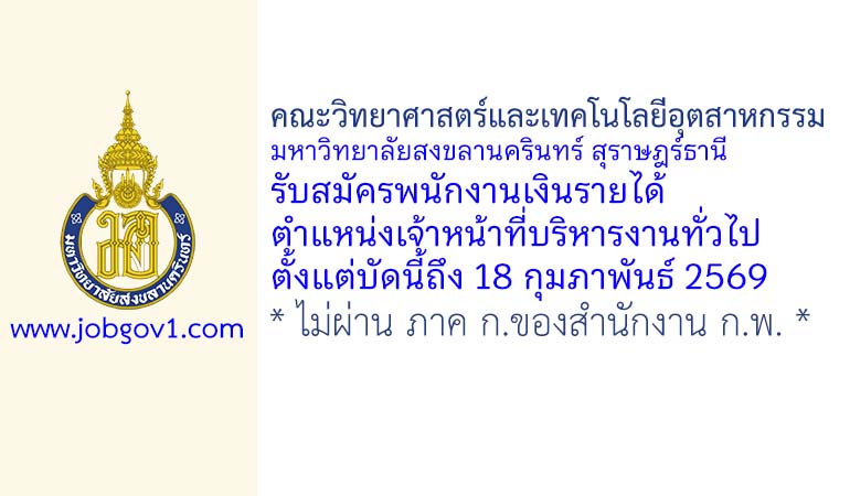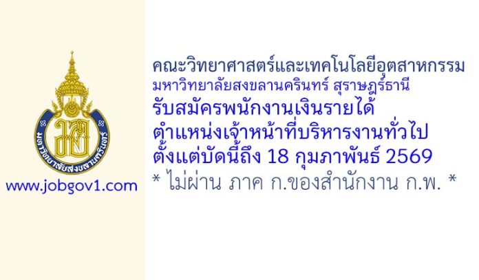 คณะวิทยาศาสตร์และเทคโนโลยีอุตสาหกรรม ม.อ.สุราษฎร์ธานี รับสมัครพนักงานเงินรายได้ ตำแหน่งเจ้าหน้าที่บริหารงานทั่วไป ตั้งแต่บัดนี้ถึง 18 กุมภาพันธ์ 2569