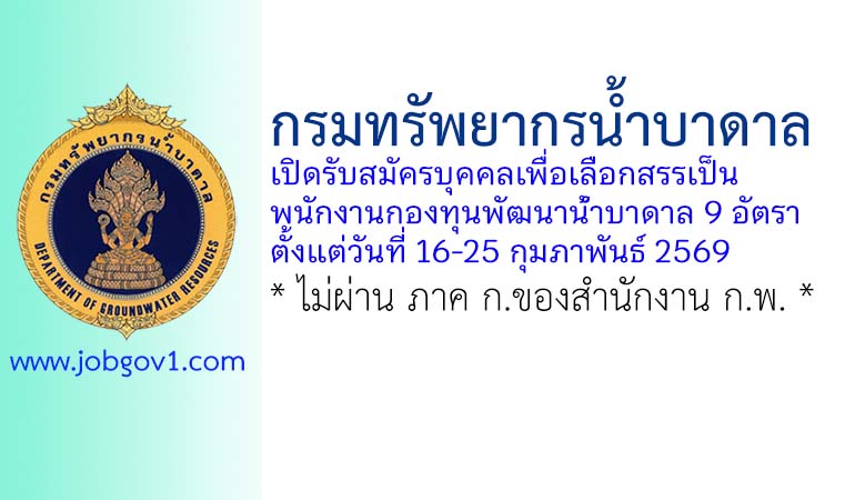 กรมทรัพยากรน้ำบาดาล รับสมัครบุคคลเพื่อเลือกสรรเป็นพนักงานกองทุนพัฒนาน้ำบาดาล 9 อัตรา ตั้งแต่วันที่ 16-25 กุมภาพันธ์ 2569