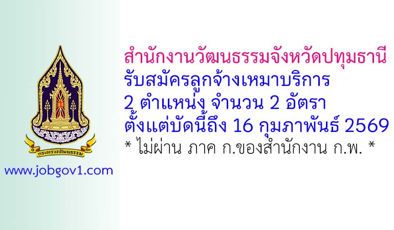 สำนักงานวัฒนธรรมจังหวัดปทุมธานี รับสมัครลูกจ้างเหมาบริการ 2 อัตรา ตั้งแต่บัดนี้ถึง 16 กุมภาพันธ์ 2569