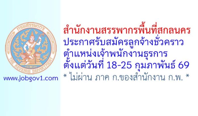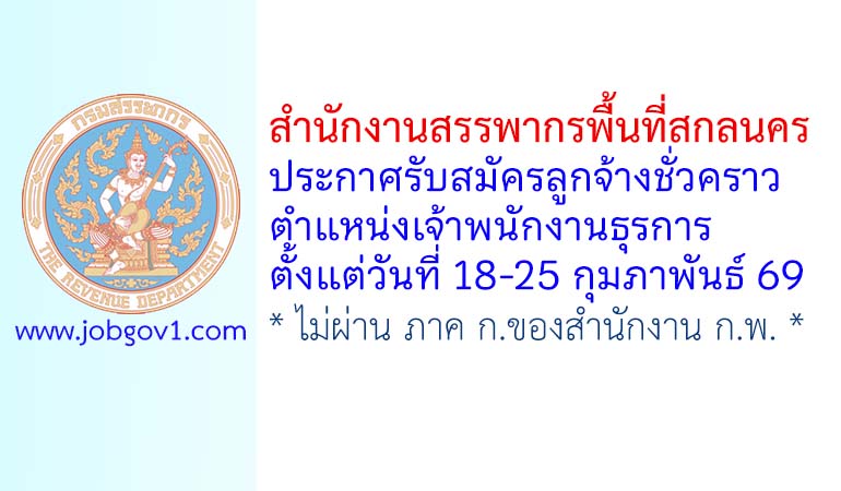 สำนักงานสรรพากรพื้นที่สกลนคร รับสมัครลูกจ้างชั่วคราว ตำแหน่งเจ้าพนักงานธุรการ ตั้งแต่วันที่ 18-25 กุมภาพันธ์ 2569