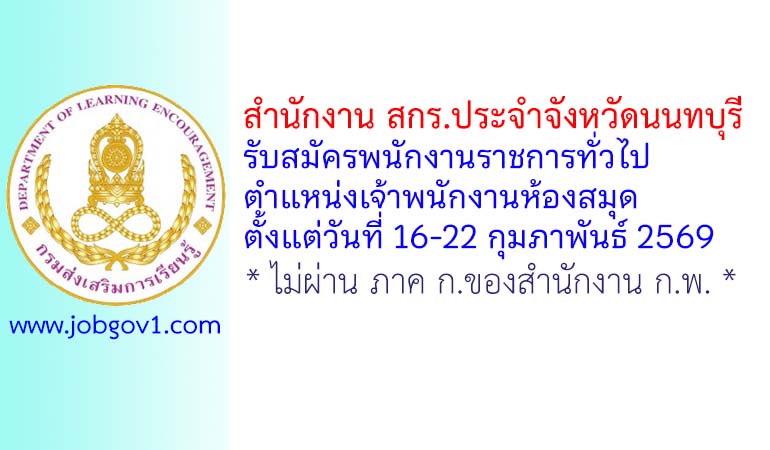 ประกาศสำนักงานส่งเสริมการเรียนรู้ประจำจังหวัดนนทบุรี เรื่อง รับสมัครบุคคลเพื่อสรรหาและเลือกสรรเป็นพนักงานราชการทั่วไป ตำแหน่งเจ้าพนักงานห้องสมุด