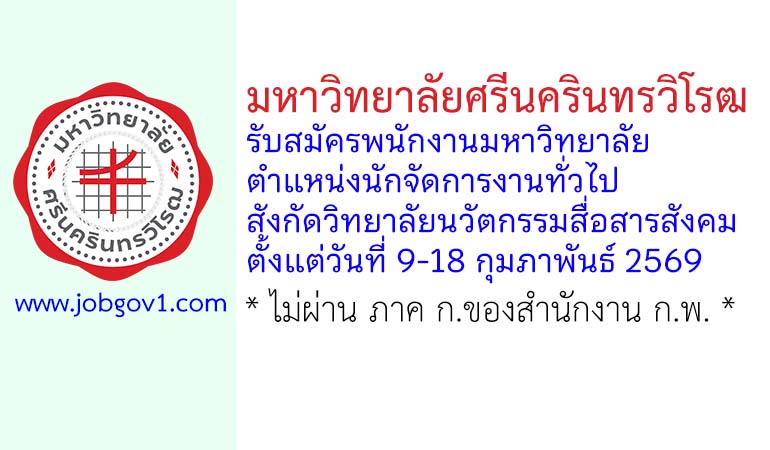 มหาวิทยาลัยศรีนครินทรวิโรฒ รับสมัครพนักงานมหาวิทยาลัย ตำแหน่งนักจัดการงานทั่วไป สังกัดวิทยาลัยนวัตกรรมสื่อสารสังคม ตั้งแต่วันที่ 9-18 กุมภาพันธ์ 2569