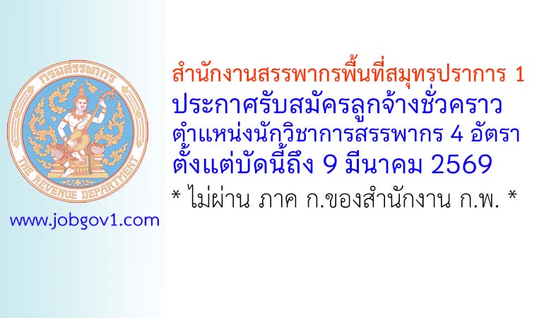 สำนักงานสรรพากรพื้นที่สมุทรปราการ 1 รับสมัครลูกจ้างชั่วคราว ตำแหน่งนักวิชาการสรรพากร 4 อัตรา ตั้งแต่บัดนี้ถึง 9 มีนาคม 2569