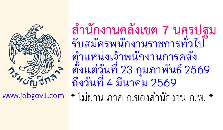 สำนักงานคลังเขต 7 นครปฐม รับสมัครพนักงานราชการทั่วไป ตำแหน่งเจ้าพนักงานการคลัง ตั้งแต่วันที่ 23 กุมภาพันธ์ – 4 มีนาคม 2569