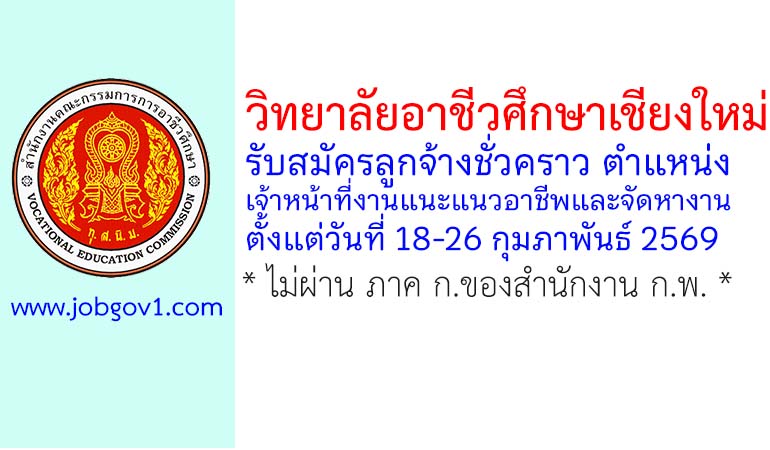 วิทยาลัยอาชีวศึกษาเชียงใหม่ รับสมัครลูกจ้างชั่วคราว ตำแหน่งเจ้าหน้าที่งานแนะแนวอาชีพและจัดหางาน ตั้งแต่วันที่ 18-26 กุมภาพันธ์ 2569